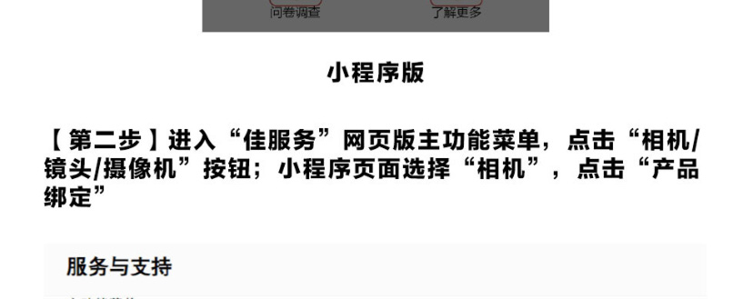 【第二步】进入“佳服务”网页版主功能菜单,点击“相机/镜头/摄像机”按钮;小程序页面选择“相机”,点击“产品绑定”;