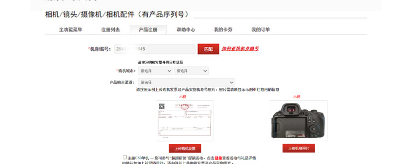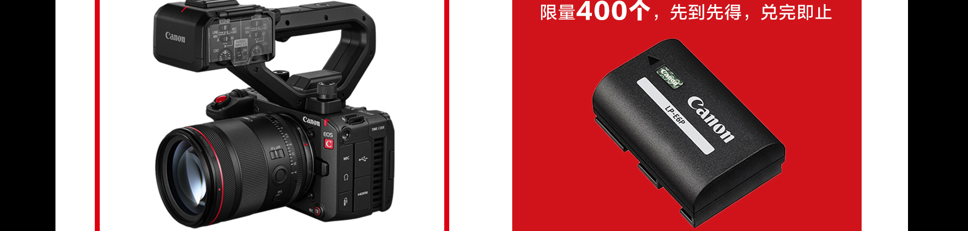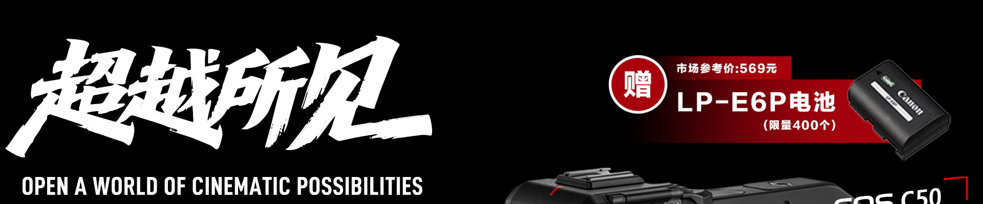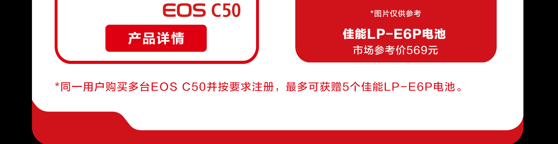 *佳能官方线上商城购买用户无需注册,系统会自动进行产品注册;活动期间内,同一用户购买多台EOS C50机身并在指定平台注册,每台机身可以获得1个佳能LP-E6P电池,最多可获赠佳能LP-E6P电池5个。