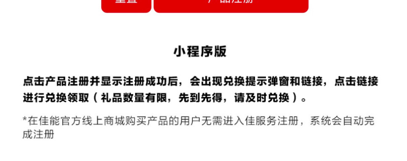 【第四步】点击产品注册并显示注册成功后,会出现兑换提示弹窗和链接,点击链接进入【佳能俱乐部】微信小程序领取兑换资格券,待资格券显示【去兑换】状态后,进行兑换(礼品数量有限,以通过审核的礼品兑换订单时间先后为准,先到先得,兑完即止),主办方将在三个工作日内对提交的兑换订单进行审核。审核通过的兑换订单将按照提交先后顺序在规定时间内进行发放。未通过的订单,请用户尽快联系事务局,确认审核详情并按要求提交相关资料。参加兑换的用户提供的登记信息必须真实准确有效。主办方将根据用户输入的信息审核和发放礼品。