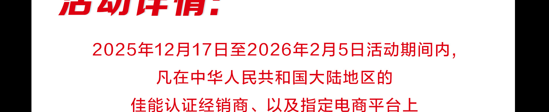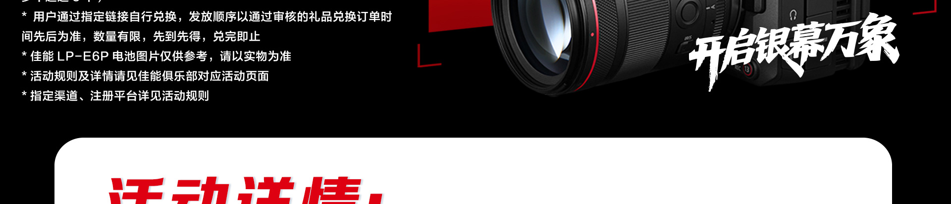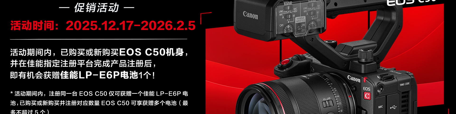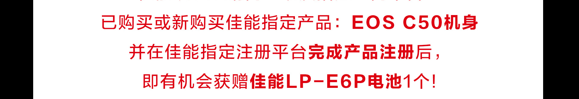 自2025年12月17日(10:00:00)至2026年2月5日(23:59:59)期间,凡在中华人民共和国大陆地区的佳能(中国)有限公司(以下简称“佳能”或“佳能中国”)的认证经销商(认证经销商信息请查询佳能官方网站的经销商查询页面https://www.canon.com.cn/purchase/dealer/index.html)以及指定电商平台(佳能官方线上商城、佳能天猫官方旗舰店、京东佳能官方旗舰店、佳能影像京东自营旗舰店、佳能小红书官方旗舰店、佳能抖音官方旗舰店) 已购买或新购买佳能指定产品(中国大陆全新正品行货):EOS C50机身,并在佳能指定注册平台(佳服务页面https://www.canon.com.cn/support/pregister/login/index,或微信【佳能佳服务】小程序)按规定完成产品注册后,即有机会获赠佳能LP-E6P电池1个;
