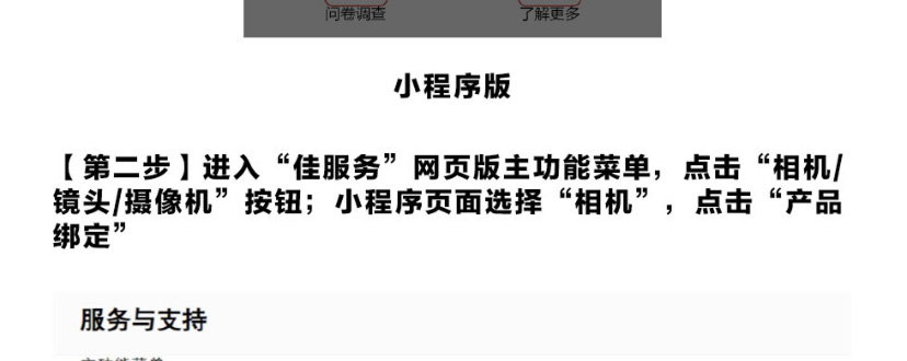 【第二步】进入“佳服务”网页版主功能菜单,点击“相机/镜头/摄像机”按钮;小程序页面选择“相机”,点击“产品绑定”;