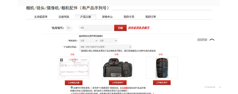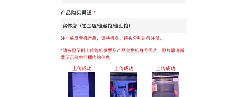 【第三步】进入页面后,输入产品序列号,匹配成功后,选择所购买的产品型号,填写产品防伪编码、产品购买渠道,购买日期等信息,并上传购机发票或收据及产品实物图片(图片中需显示清晰的购买日期及产品编号)。