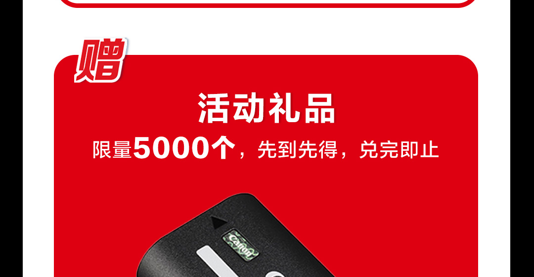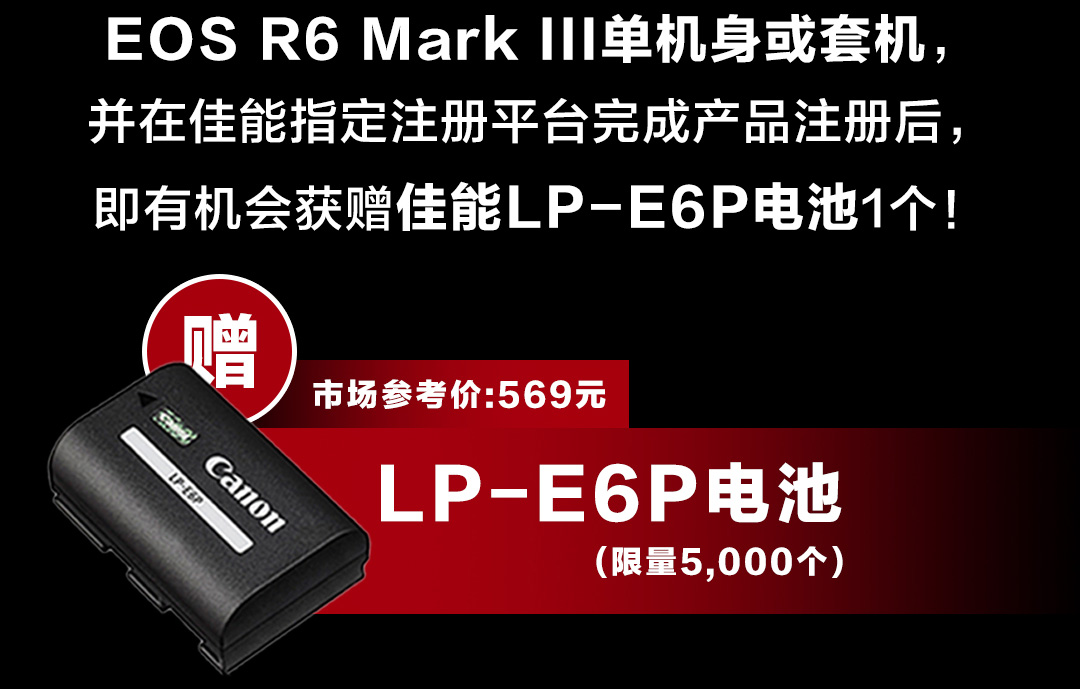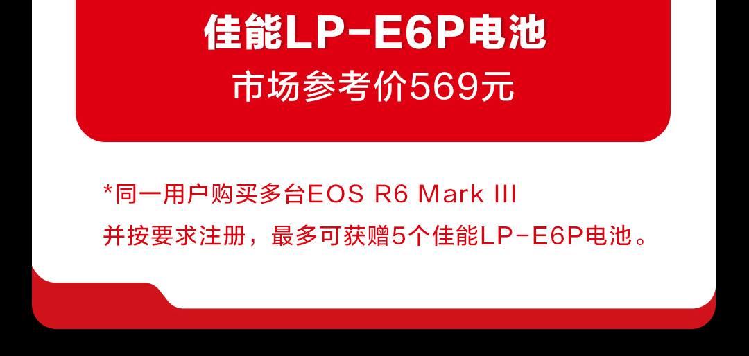 *佳能官方线上商城购买用户无需注册,系统会自动进行产品注册;活动期间内,同一用户购买多台EOS R6 Mark III单机身或指定套机并在指定平台注册,每台机身/套机可以获得1个佳能LP-E6P电池,最多可获赠佳能LP-E6P电池5个。