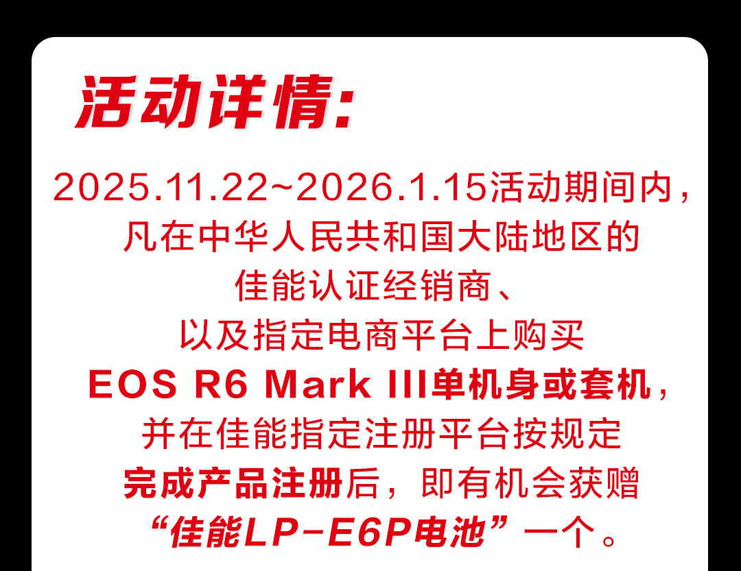自2025年11月22日(10:00:00)至2026年1月15日(23:59:59)期间,凡在中华人民共和国大陆地区的佳能(中国)有限公司(以下简称“佳能”或“佳能中国”)的认证经销商(认证经销商信息请查询佳能官方网站的经销商查询页面https://www.canon.com.cn/purchase/dealer/index.html)以及指定电商平台(佳能官方线上商城、佳能天猫官方旗舰店、京东佳能官方旗舰店、佳能影像京东自营旗舰店、佳能小红书官方旗舰店、佳能抖音官方旗舰店)上购买佳能指定产品(中国大陆全新正品行货):EOS R6 Mark III单机身或指定套机,并在佳能指定注册平台(佳服务页面https://www.canon.com.cn/support/pregister/login/index,或微信【佳能佳服务】小程序)按规定完成产品注册后,即有机会获赠佳能LP-E6P电池1个;