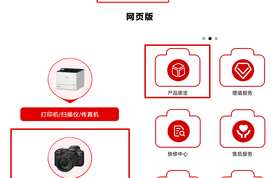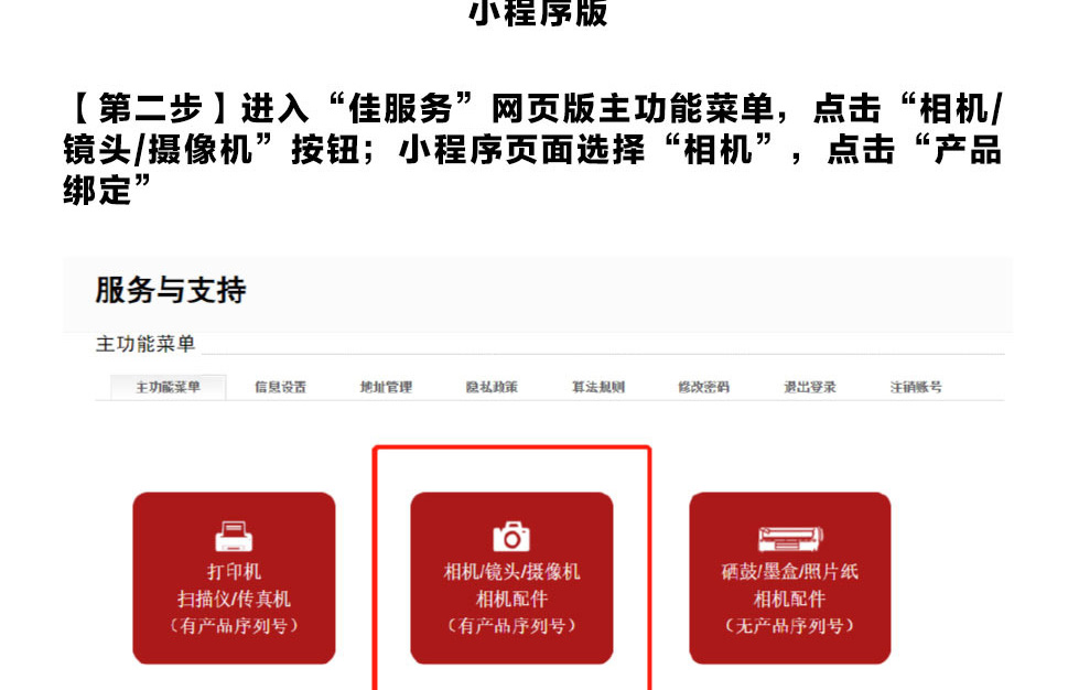 【第二步】进入“佳服务”网页版主功能菜单,点击“相机/镜头/摄像机”按钮;小程序页面选择“相机”,点击“产品绑定”;