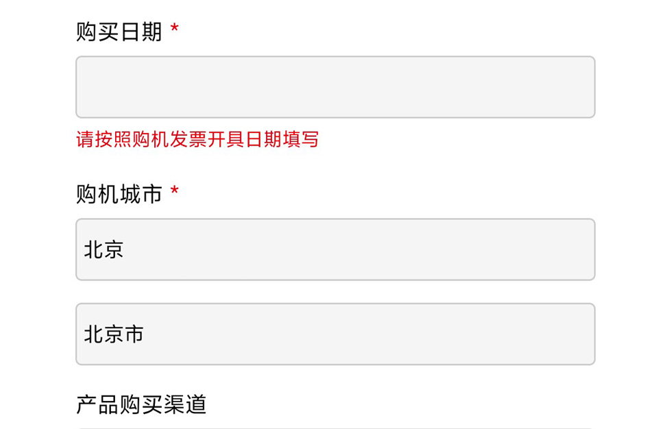 【第三步】进入页面后,输入产品序列号,匹配成功后,选择所购买的产品型号,填写产品防伪编码、产品购买渠道,购买日期等信息,并上传购机发票或收据及产品实物图片(图片中需显示清晰的购买日期及产品编号)。