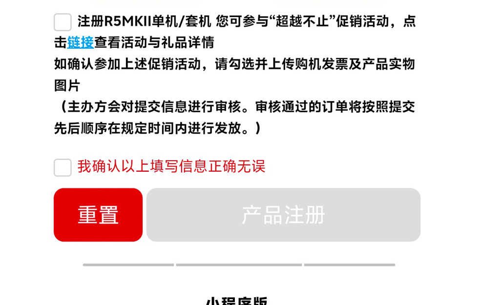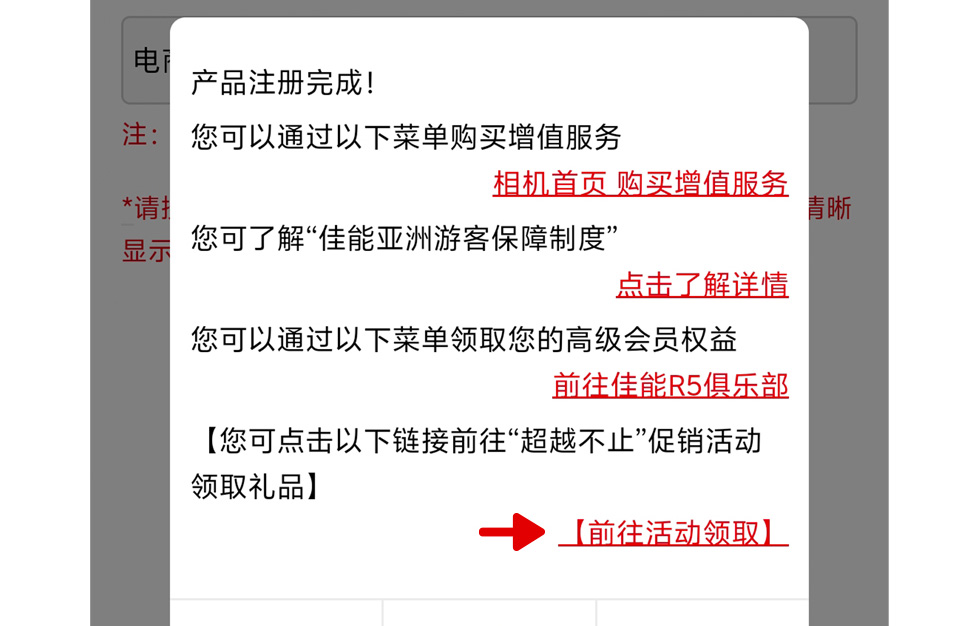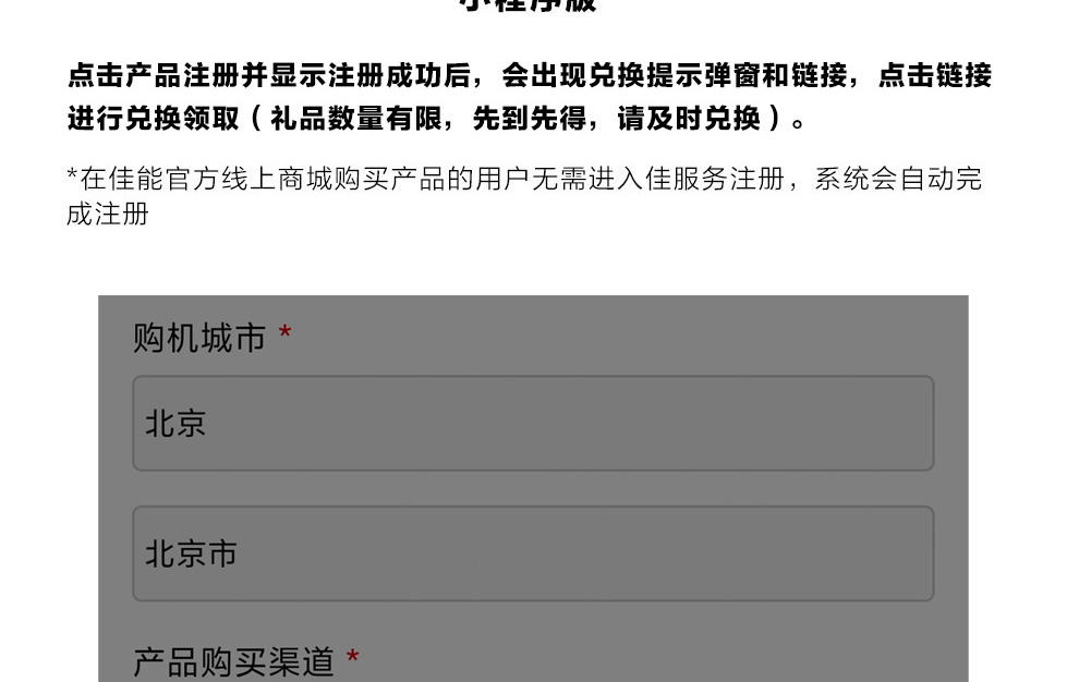 【第四步】点击产品注册并显示注册成功后,会出现兑换提示弹窗和链接,点击链接进入【佳能俱乐部】微信小程序领取兑换资格券,待资格券显示【去兑换】状态后,进行兑换(礼品数量有限,以通过审核的礼品兑换订单时间先后为准,先到先得,兑完即止),主办方将在7个工作日内对提交的兑换订单进行审核。审核通过的兑换订单将按照提交先后顺序在规定时间内进行发放。未通过的订单,请用户尽快联系事务局,确认审核详情并按要求提交相关资料。参加兑换的用户提供的登记信息必须真实准确有效。主办方将根据用户输入的信息审核和发放礼品。