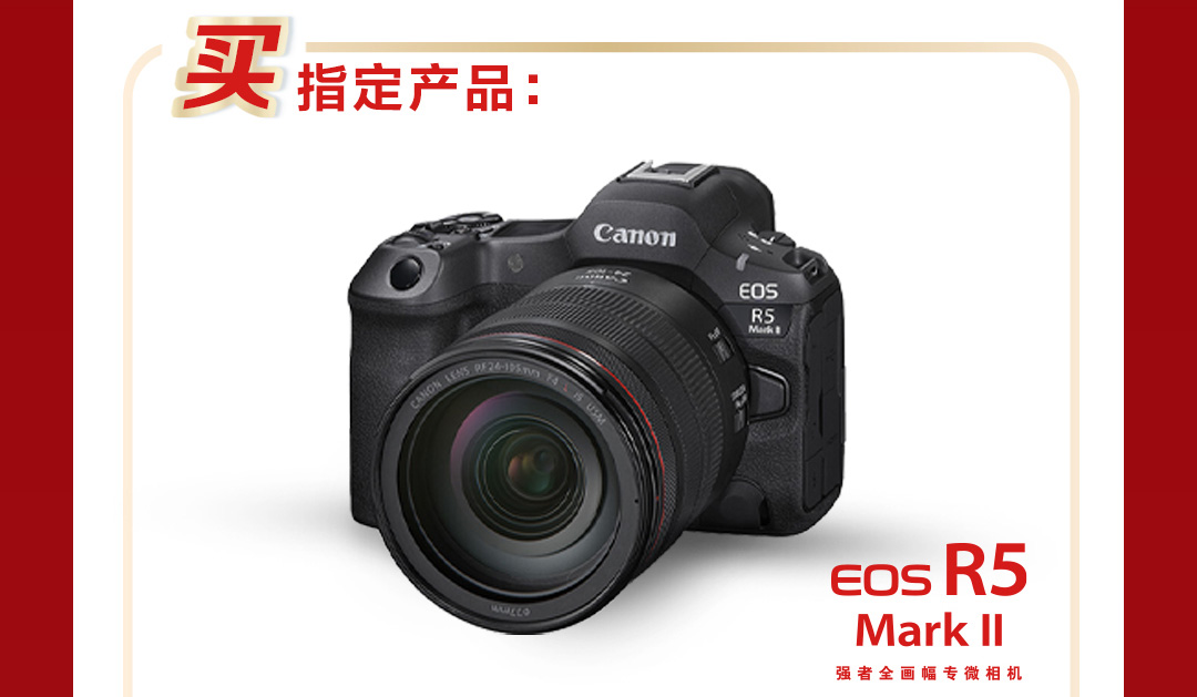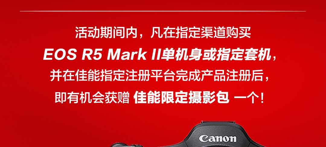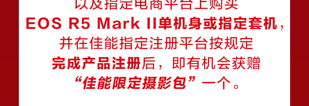 自2026年1月26日(00:00:00)至2026年3月31日(23:59:59)期间,凡在中华人民共和国大陆地区的佳能(中国)有限公司(以下简称“佳能”或“佳能中国”)的认证经销商(认证经销商信息请查询佳能官方网站的经销商查询页面http://www.canon.com.cn/buy/sale/index.html)以及指定电商平台(佳能官方线上商城、佳能天猫官方旗舰店、京东佳能官方旗舰店、佳能影像京东自营旗舰店、佳能小红书官方旗舰店、佳能抖音官方旗舰店)上购买佳能指定产品(中国大陆全新正品行货):EOS R5 Mark II单机身或指定套机,并在佳能指定注册平台(佳服务页面https://www.canon.com.cn/support/pregister/login/index,或微信【佳能佳服务】小程序)按规定完成产品注册后,即有机会获赠佳能限定摄影包1个(尺寸:约44*30*17cm;礼品材质:高性能防水布+PU);