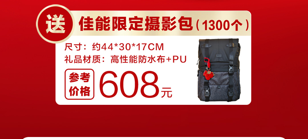 礼品名称:佳能限定摄影包(尺寸:约44*30*17cm;礼品材质:高性能防水布+PU)