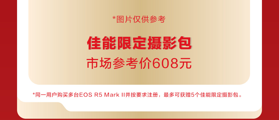 *佳能官方线上商城购买用户无需注册,系统会自动进行产品注册;活动期间内,同一用户购买多台EOS R5 Mark II单机身或指定套机并在指定平台注册,每台机身/套机可以获得1个佳能限定摄影包,最多可获赠佳能限定摄影包5个。